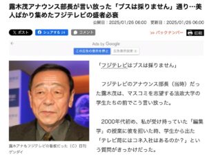 露木茂は過去に「フジテレビはブスは採りません」と発言していた