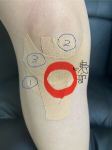 1. テープを15㎝程に切り膝下のオスグッドが出てる部分を押し込むようにテープを貼ります